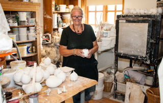 Hun kommer oprindeligt fra Aabenraa, og har i mange år arbejdet med keramik og drejet et utal af skåle, krukker, potter, og fade.