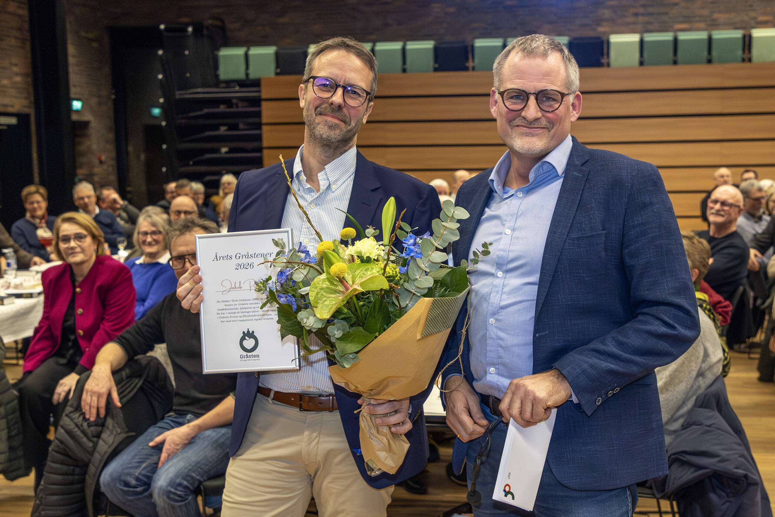 Tildelingen af prisen som Årets Gråstener 2026 til Jakob Petersen markerede samtidig afslutningen på Jakob Petersens mangeårige bestyrelsesarbejde i Gråsten Forum, hvor han har været en central drivkraft og samlende person. Til højre ses Carsten Clausen Kock.