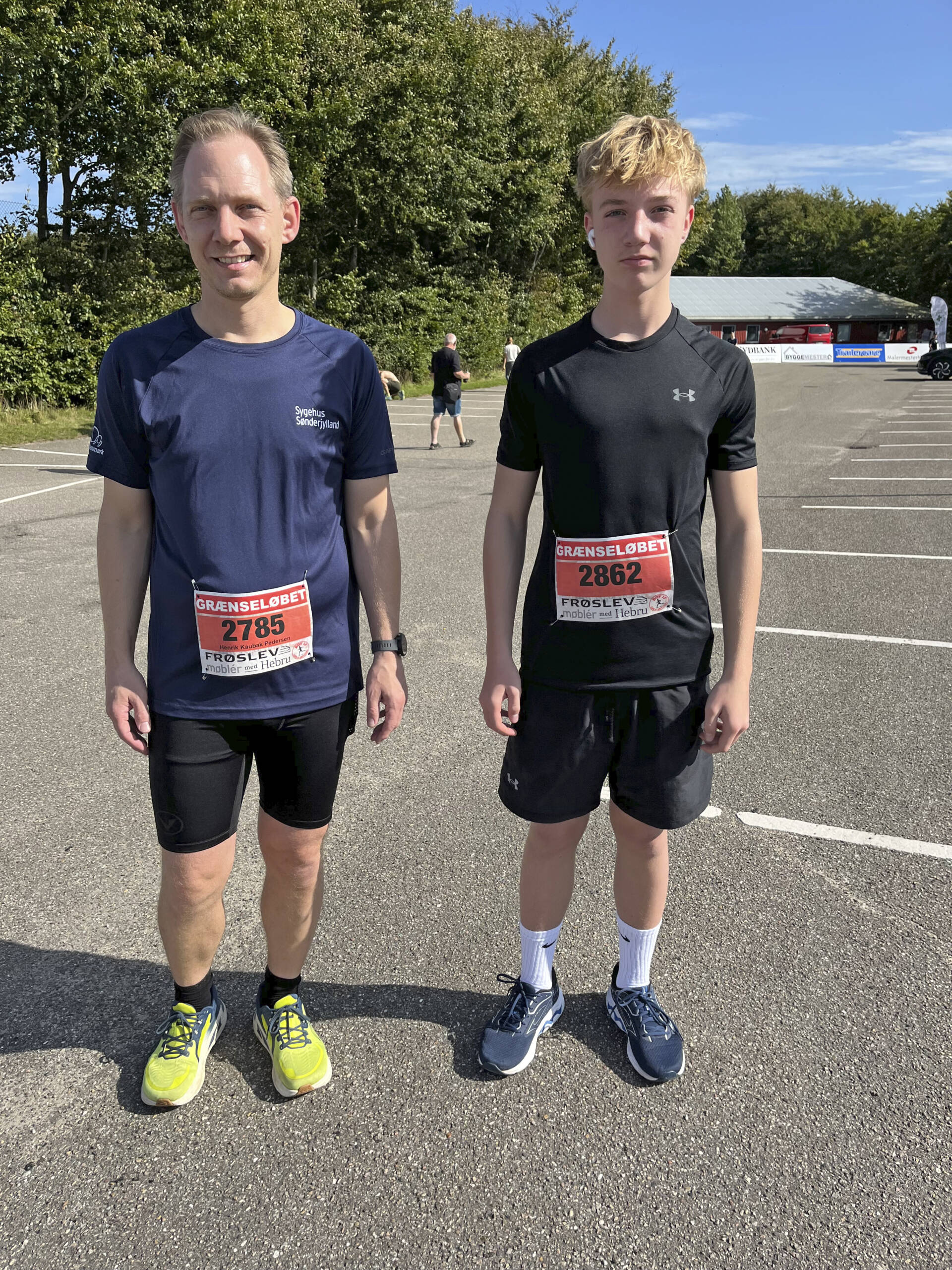 Far og søn gør klar til 11 km løbet. Fra venstre radiolog ved Sønderborg Sygehus, 49-årige Henrik Kaubak Pedersen og sønnen, 15-årige Jeppe