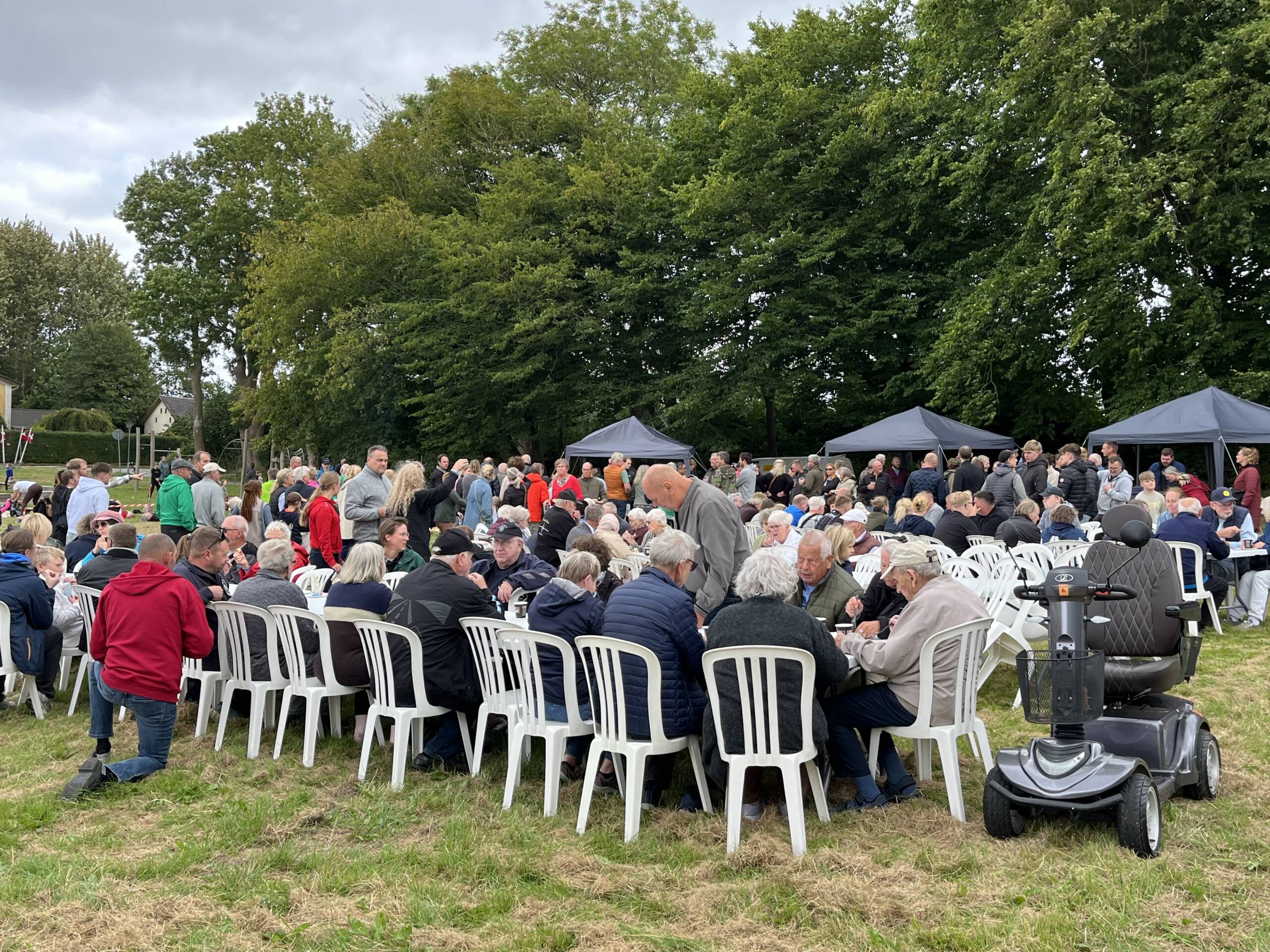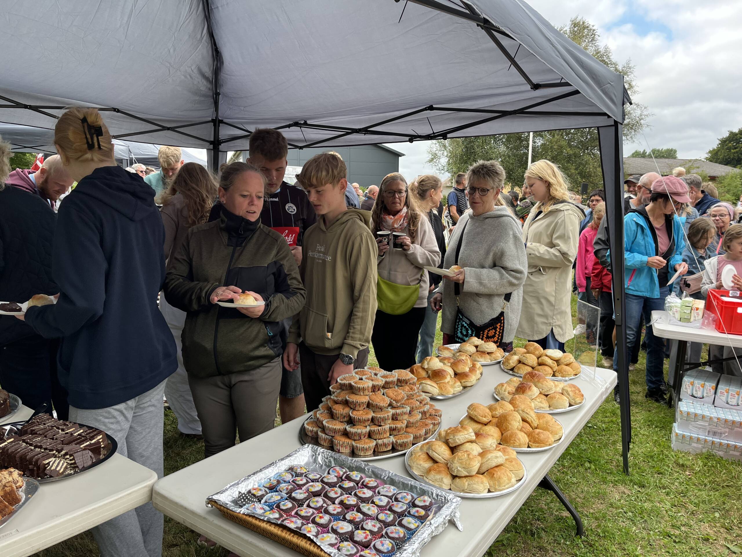 “I Holbøl bor 441 borgere, og jeg er sikker på, at de alle er her i byparken i dag. Vi serverer også det store sønderjyske kaffebord i dag, med 42 forskellige slags kager, som lokale har bagt. Her i Holbøl er det ikke de få, det er os alle sammen som hjælper, når der er behov for det”, sagde en stolt formand Christian Duus.