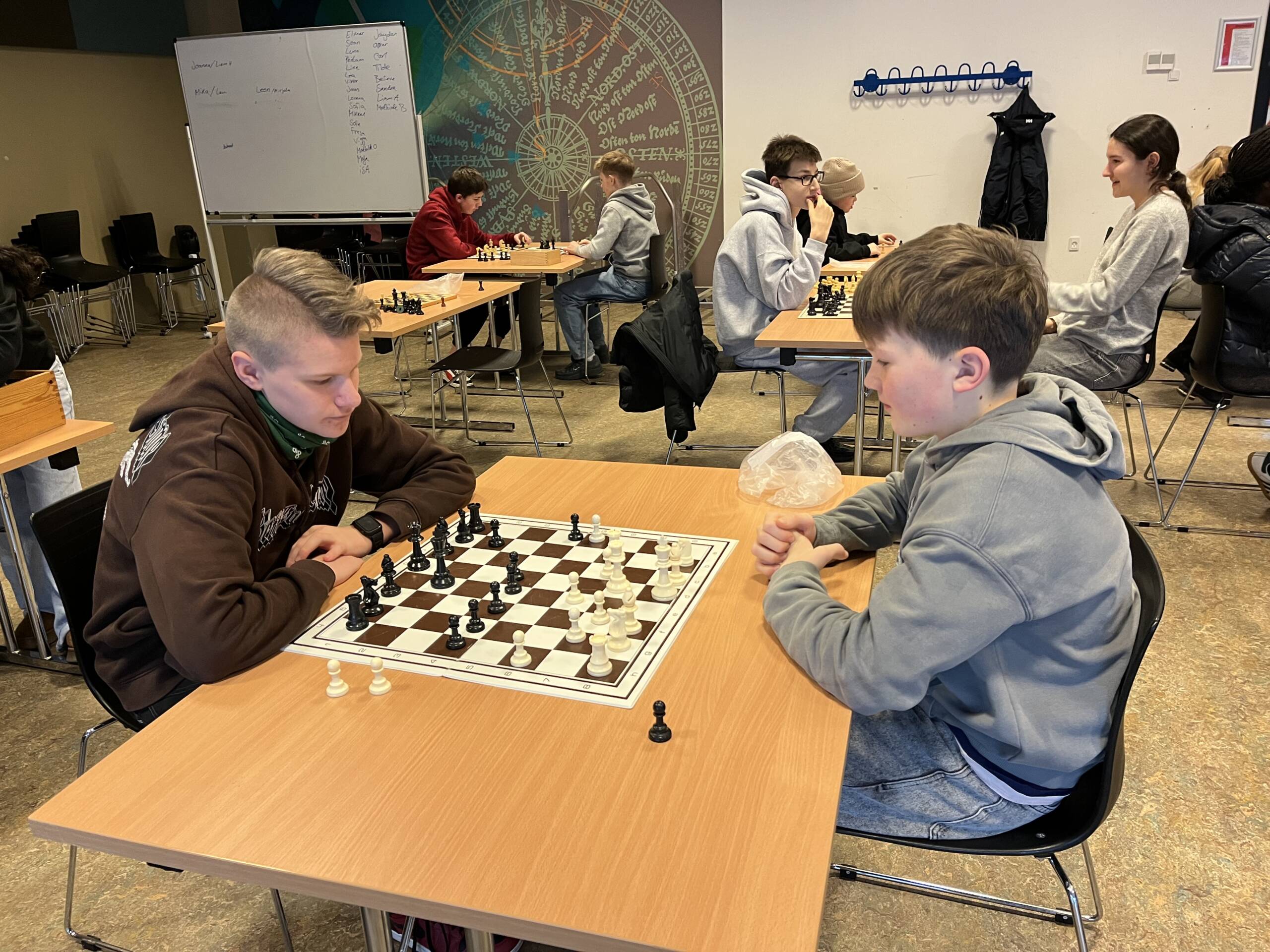40 elever fra 6. årgang på Lyreskovskolen i Bov spillede skoleskak i Auditoriet.