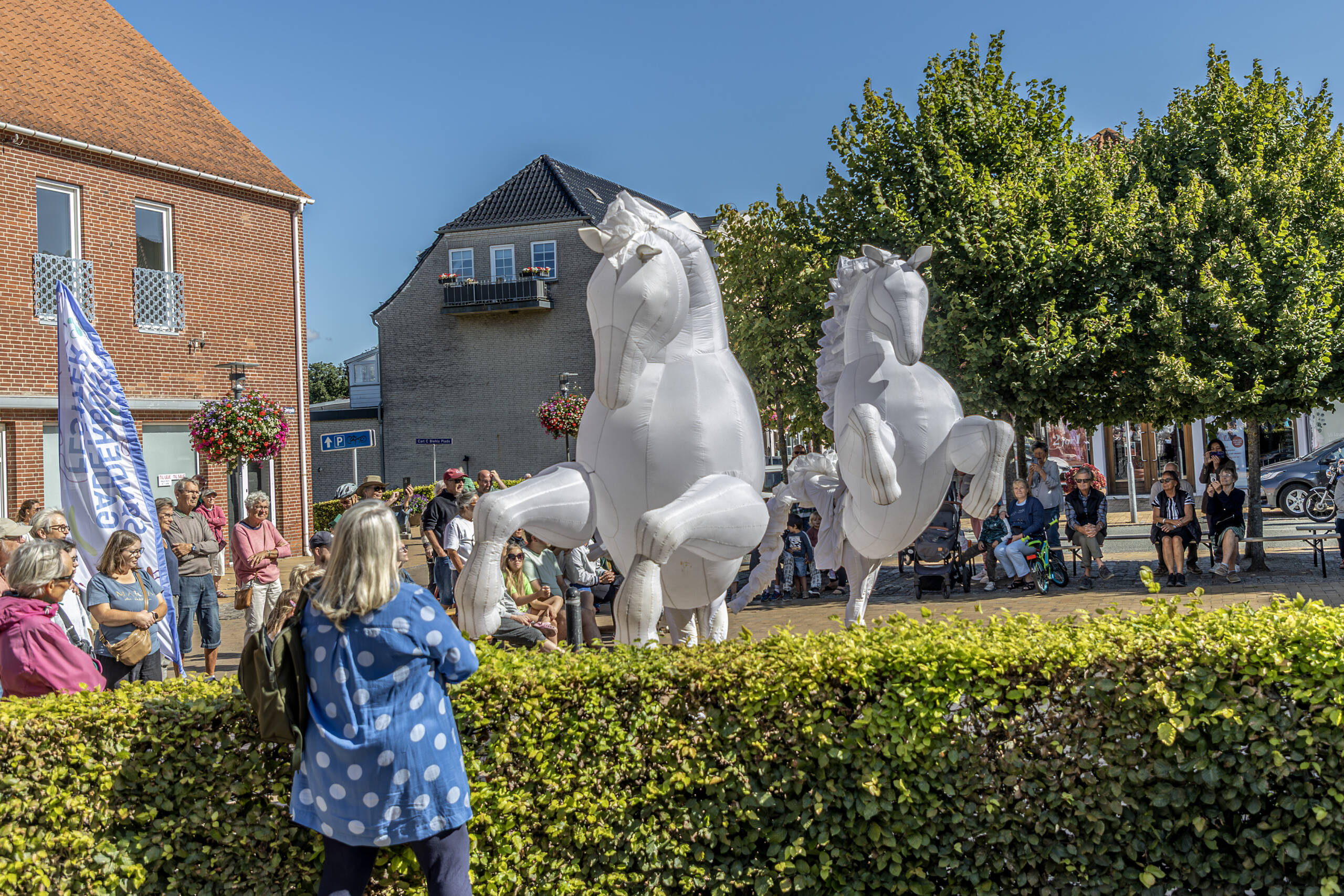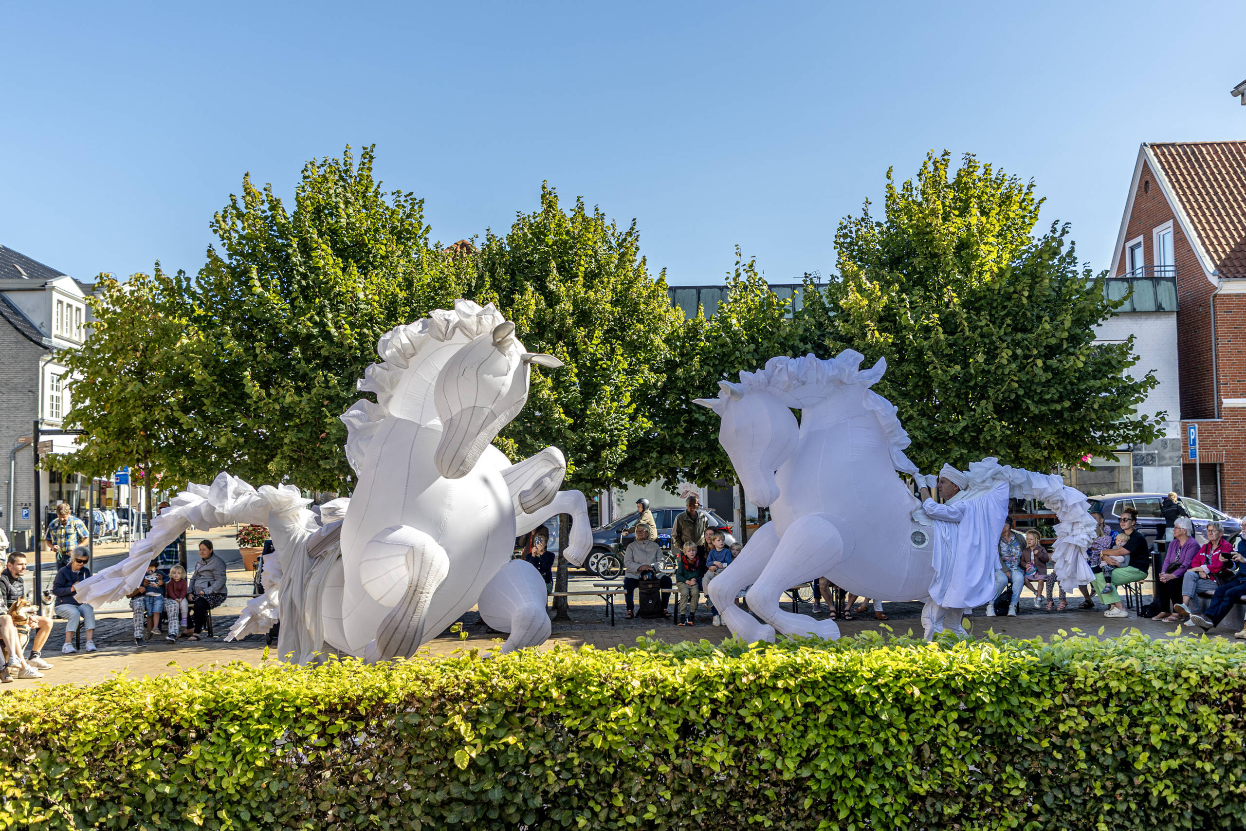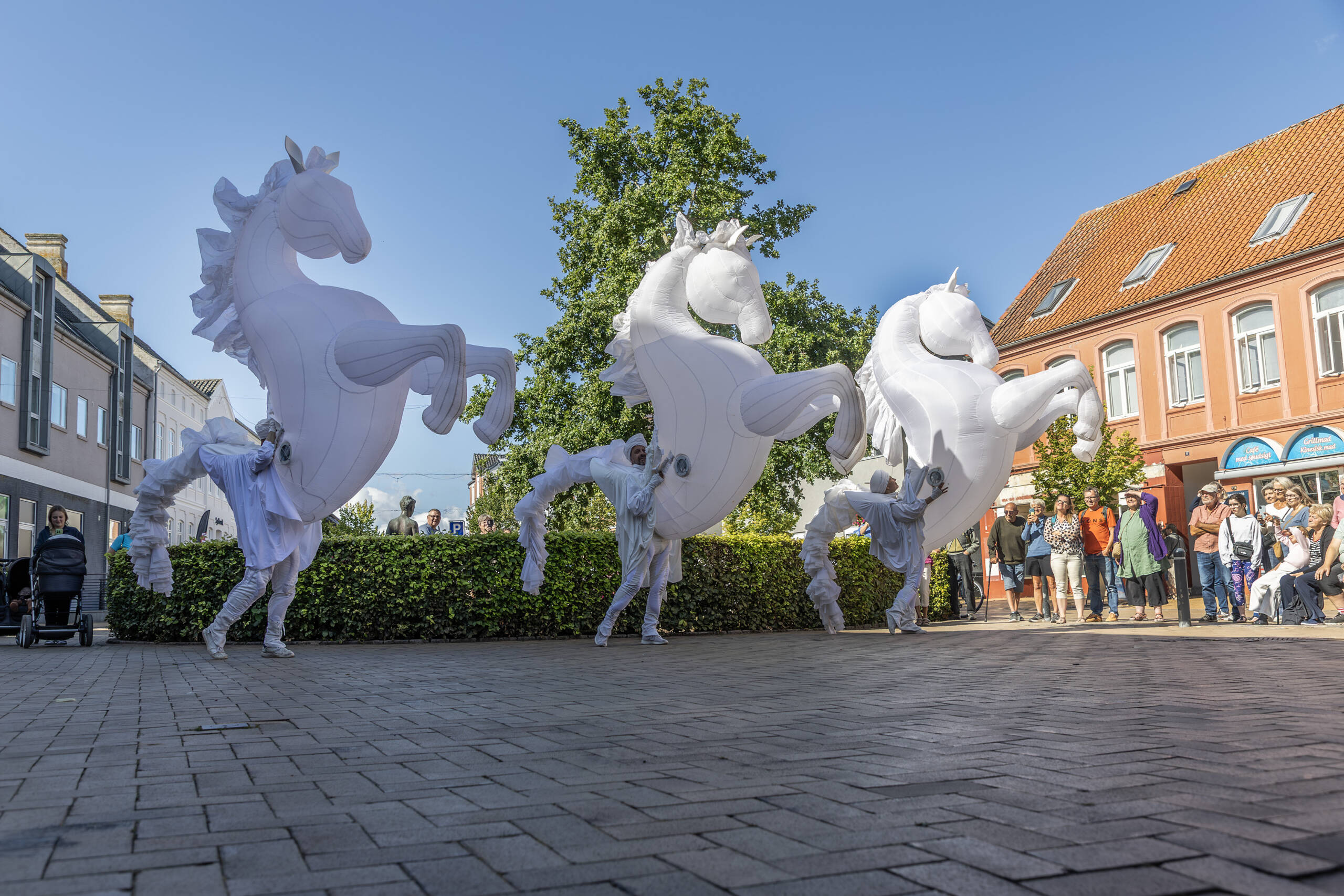 Publikum i alle aldre lod sig rive med, da enorme hvide heste dukkede op blandt de fremmødte.